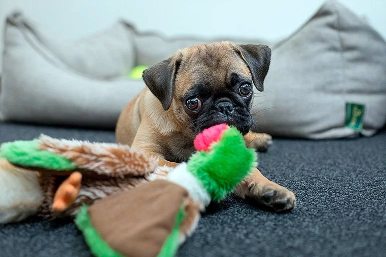 El Pug o Carlino es un perro originario de China, aunque la raza se desarrolla en Europa desde el año 1500. El cuerpo es cuadrado y compacto. Posee una cabeza proporcionada de rostros chato y orejas caídas; la cola, por su parte, se curva sobre la parte baja de la espalda. Su peso oscila entre los 6 y los 8 kilos.